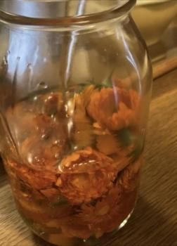 自家製無農薬カレンデュラを精製ホホバオイルに漬けて搾りました。